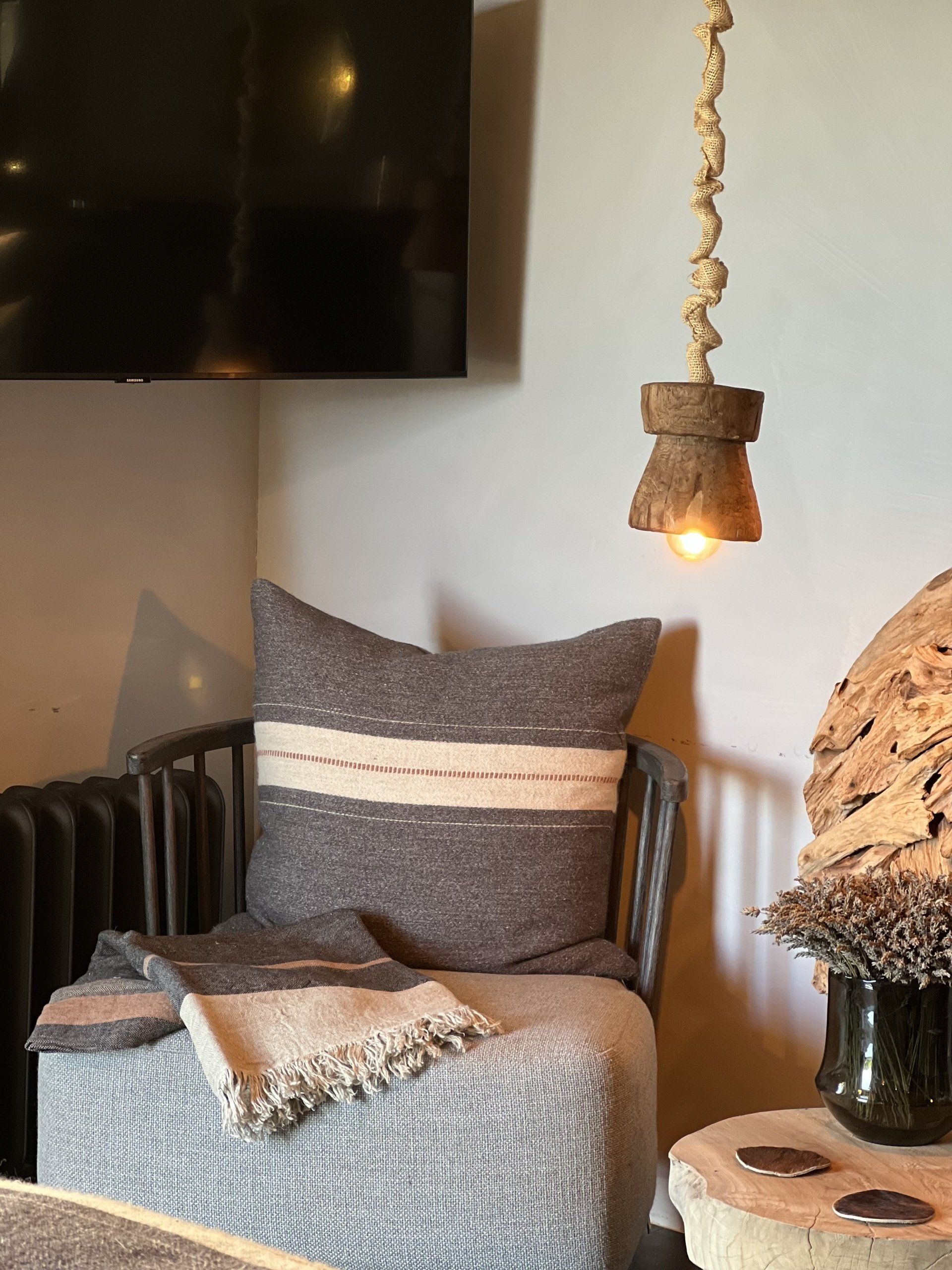 the blue nature room has a charm and a natural warmth thanks to its aged wooden ceiling inspired by old sheepfolds.